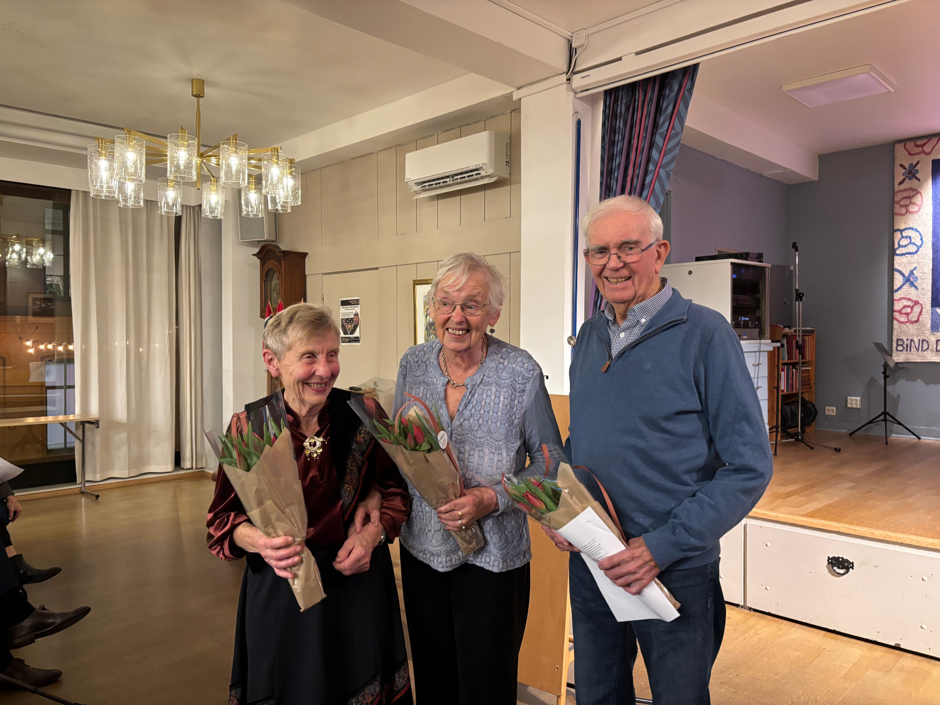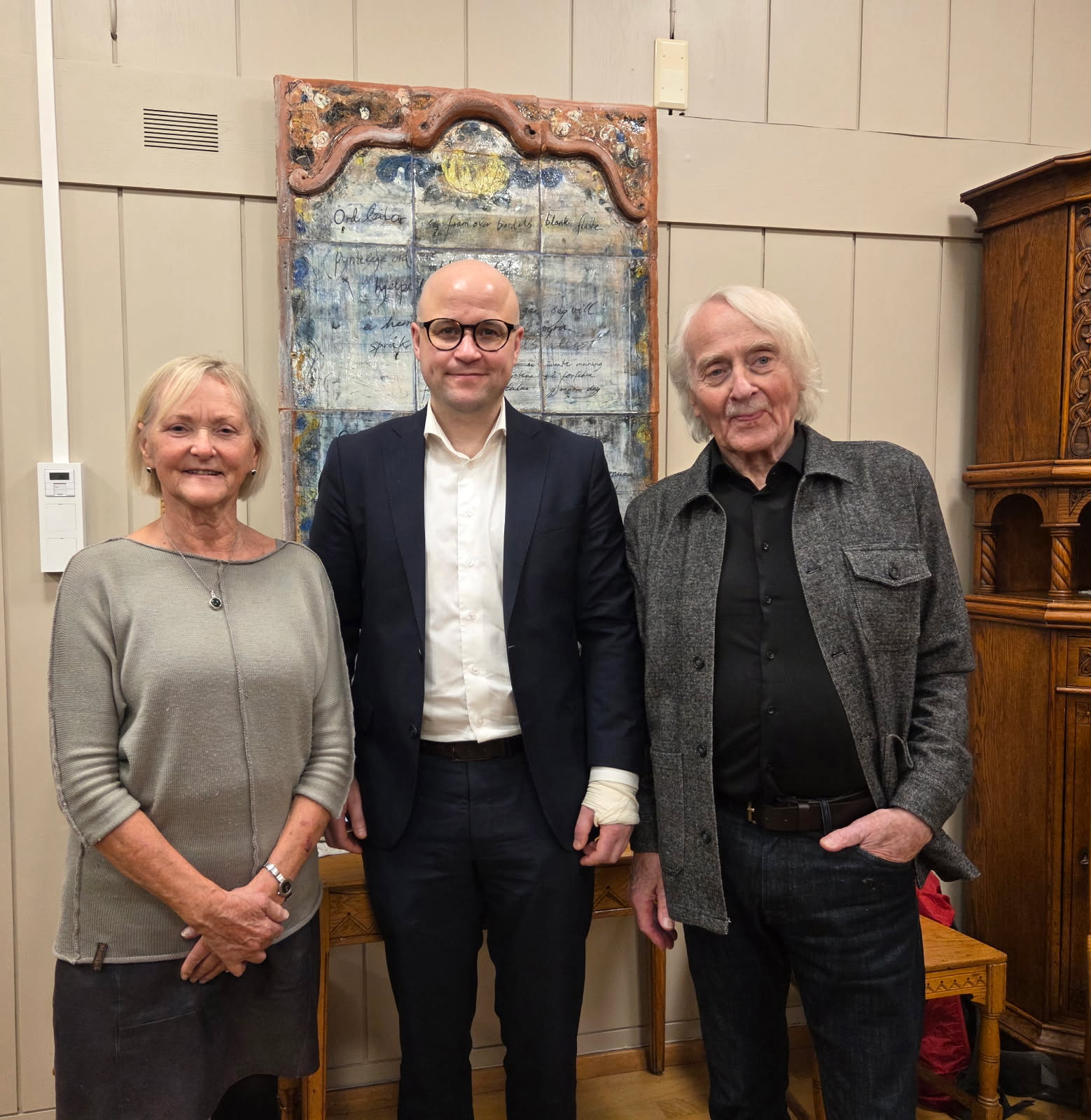 Inga Lauvdal, Peder Lofnes Hauge og Paal-Helge Haugen. Keramikktavla av Grete Nash i bakgrunnen.